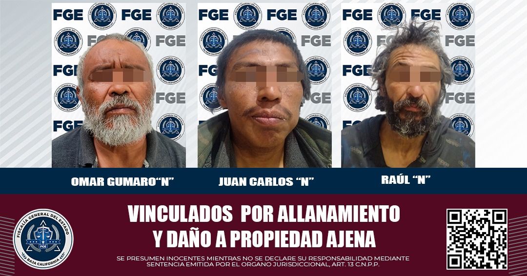 MEXICALI, BAJA CALIFORNIA. - La Fiscalía Regional de Mexicali, a través de la Unidad de Investigación de Detenidos Poniente, logró la vinculación a proceso de tres individuos acusados de los delitos de allanamiento de morada y daño en propiedad ajena, en audiencias celebradas por separado.