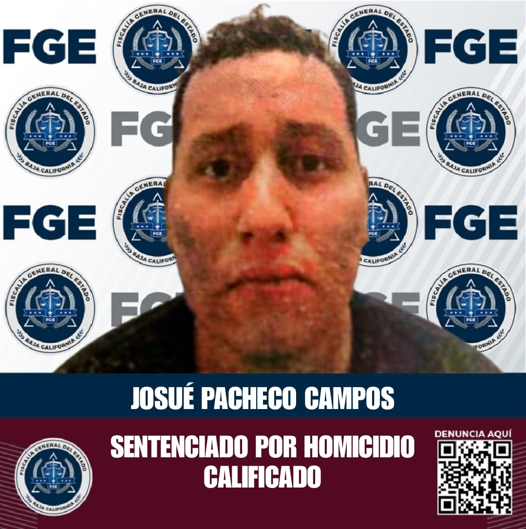 Por el delito de homicidio calificado, se sentenció a 20 años en prisión a Josué Pacheco Campos, esto luego de comprobar que el día 4 de octubre del año 2013, aproximadamente a las 09:20 horas, en las inmediaciones de la Playa en Rosarito, cercano a una torre de vigilancia salvavidas, efectúo detonaciones de arma de fuego en contra de la víctima, causándole la muerte, a causa de un shock hipovolémico secundario a heridas perforantes y penetrantes de tórax por proyectiles de arma de fuego; conducta ejecutada con la calificativa de ventaja.