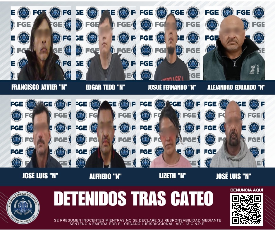 ENSENADA, BAJA CALIFORNIA. - La Fiscalía General del Estado (FGE) detuvo a ocho individuos durante cateos en Ensenada, como parte de investigaciones por narcomenudeo.
