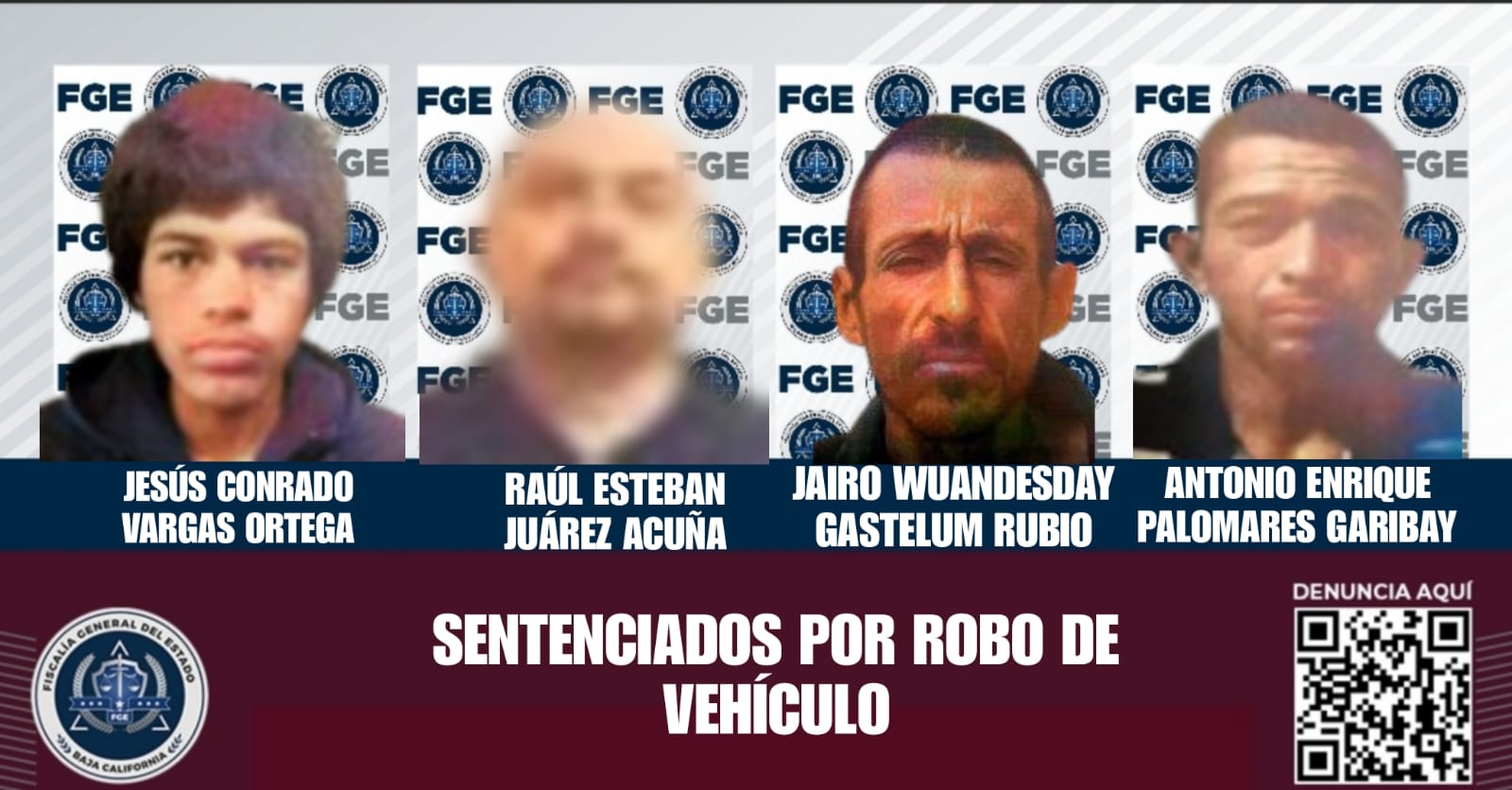 TIJUANA, BAJA CALIFORNIA. - La Fiscalía Regional de Tijuana, a través de la Unidad de Investigación Especializada en Robo de Vehículos, informa sobre la obtención de sentencias condenatorias contra cuatro individuos por su participación en delitos relacionados con el robo de vehículos. Los responsables fueron sentenciados mediante un procedimiento abreviado con una pena de dos años en prisión.