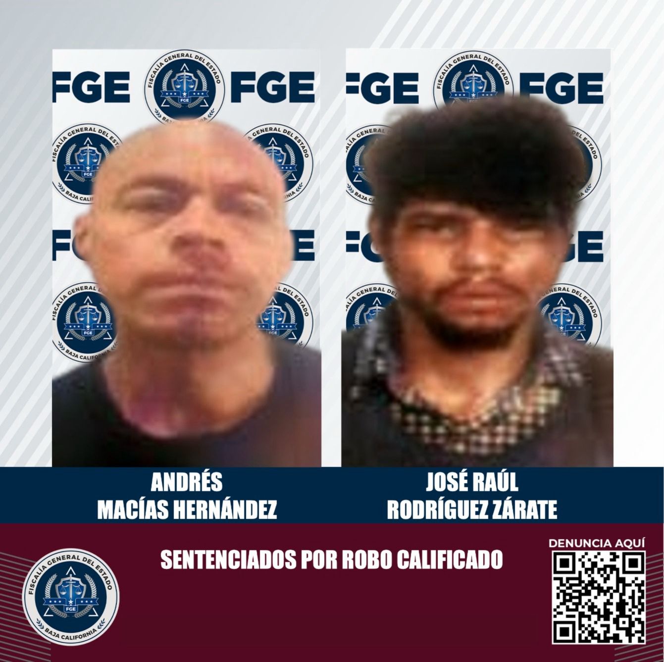TIJUANA, BAJA CALIFORNIA. - La Fiscalía Regional de Tijuana, a través de la Unidad de Investigación de Robos Zona La Mesa, informa sobre la obtención de dos sentencias condenatorias de tres años y ocho meses de prisión contra dos hombres por su participación en el delito de robo calificado en hechos distintos.