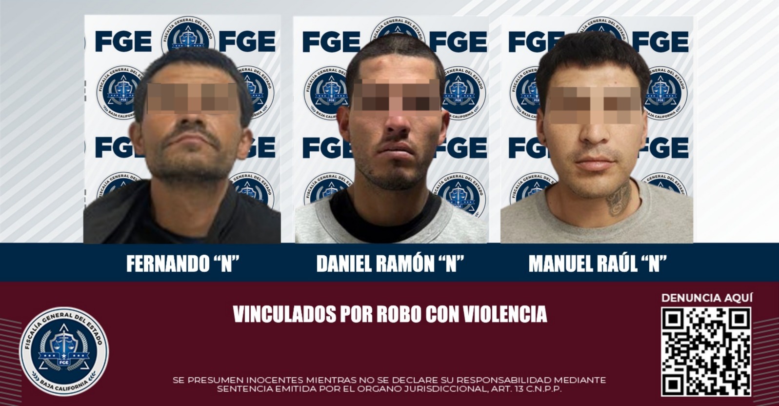 MEXICALI, BAJA CALIFORNIA. - La Fiscalía Regional de Mexicali, a través de la Unidad de Investigación de Robos Oriente y Poniente, logró la vinculación a proceso de tres individuos involucrados en delitos de robo con violencia, en audiencias celebradas por separado.