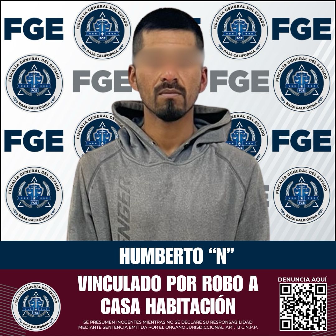 SAN QUINTÍN, BAJA CALIFORNIA. - Por su presunta participación en un robo a casa habitación, la Fiscalía Regional de San Quintín presentó cargos contra Humberto “N”, logrando el auto de vinculación a proceso y la imposición de prisión preventiva como medida cautelar contra el imputado.
