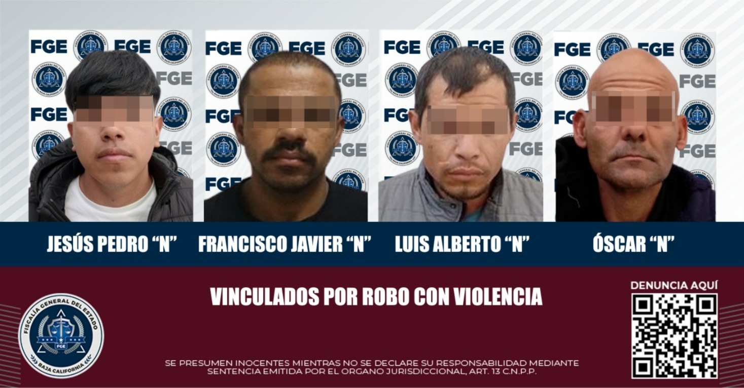 MEXICALI, BAJA CALIFORNIA. - La Fiscalía Regional de Mexicali, a través de las Unidades de Investigación con Detenidos Poniente y Robos, logró la vinculación a proceso de cuatro personas por el delito de robo, mediante audiencias celebradas de forma separada.
