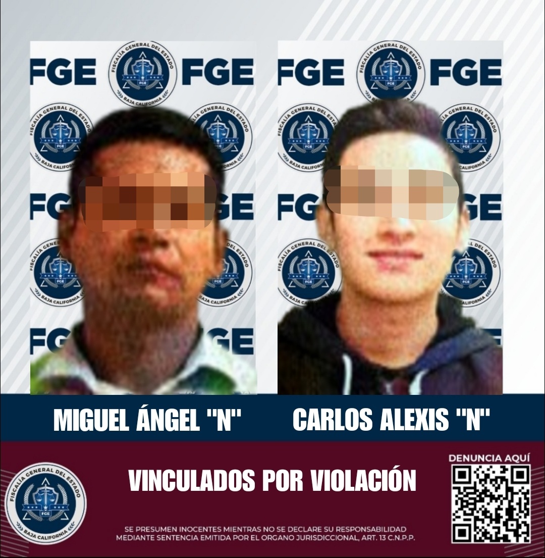 TIJUANA, BAJA CALIFORNIA. - La Fiscalía General del Estado (FGE), a través de la Fiscalía Especializada en Delitos contra la Mujer por Razón de Género, informa sobre los avances en la impartición de justicia en dos casos de violación registrados en la ciudad. Como resultado de las investigaciones y diligencias ministeriales, se logró la vinculación a proceso de Miguel Ángel “N” y Carlos Alexis “N” por el delito de violación.