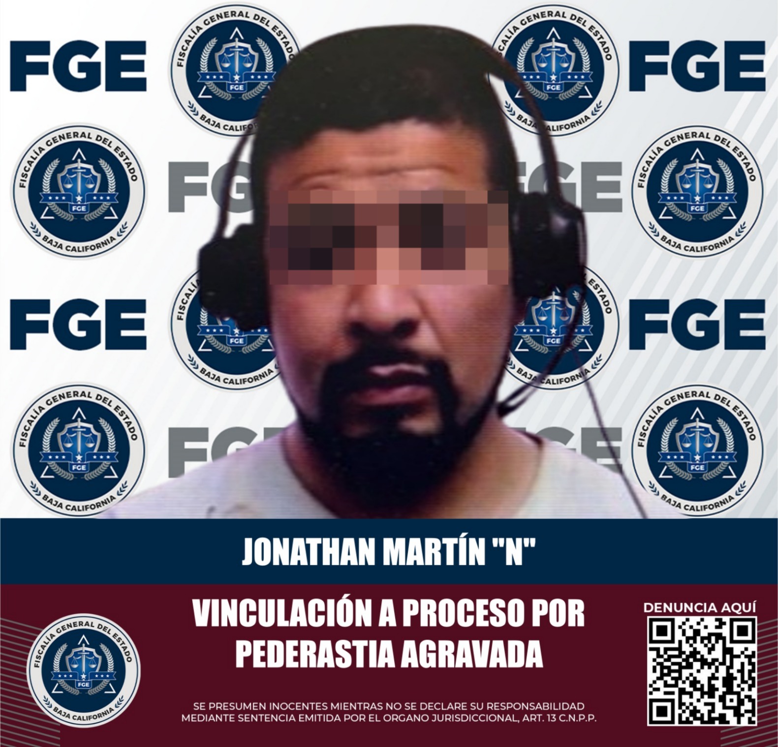 TIJUANA, BAJA CALIFORNIA.- La unidad de investigación especializada en delitos sexuales, adscrita a la Fiscalía Especializada en Delitos Contra Mujeres por Razón de Género, dio a conocer que, por el delito de pederastia agravada, un hombre permanecerá en prisión preventiva justificada.