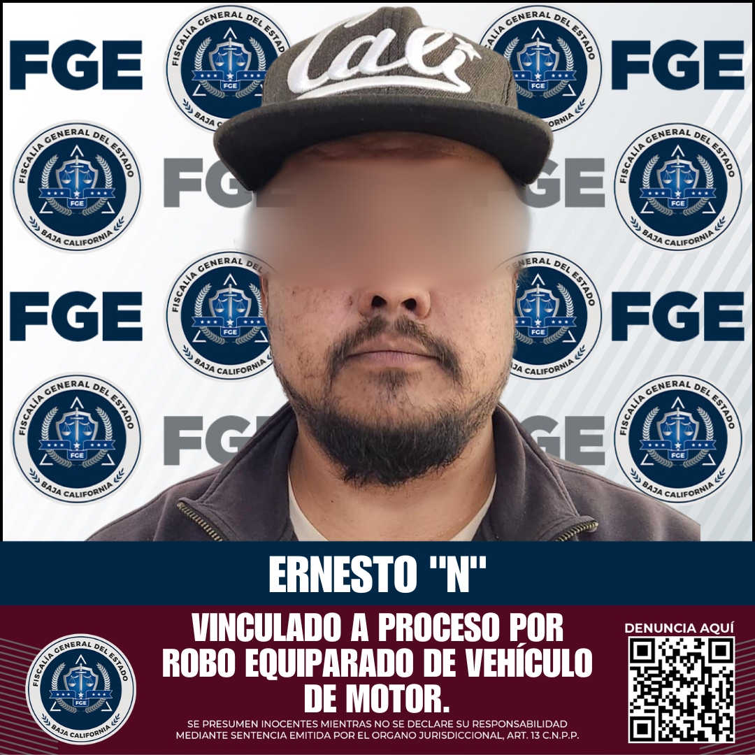 SAN QUINTÍN, BAJA CALIFORNIA. - La Fiscalía Regional de San Quintín obtuvo la vinculación a proceso de Ernesto "N", por su presunta responsabilidad en el delito de robo equiparado de vehículo de motor, en modalidad de uso.