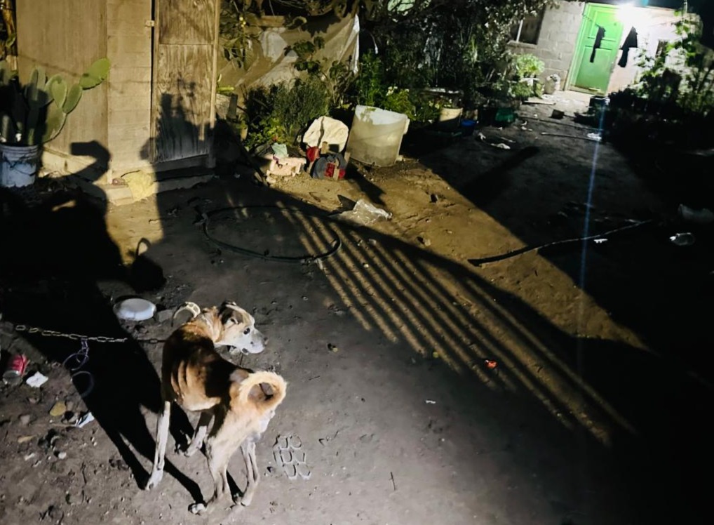 Agentes del Ministerio Público y de la Agencia Estatal de Investigación ingresaron al predio y localizaron al perro, de raza criolla, color café con blanco y aproximadamente 4 años, que estaba amarrado con una cadena de metal de aproximadamente 30 centímetros de largo, sujetado sobre la puerta principal de acceso al predio.