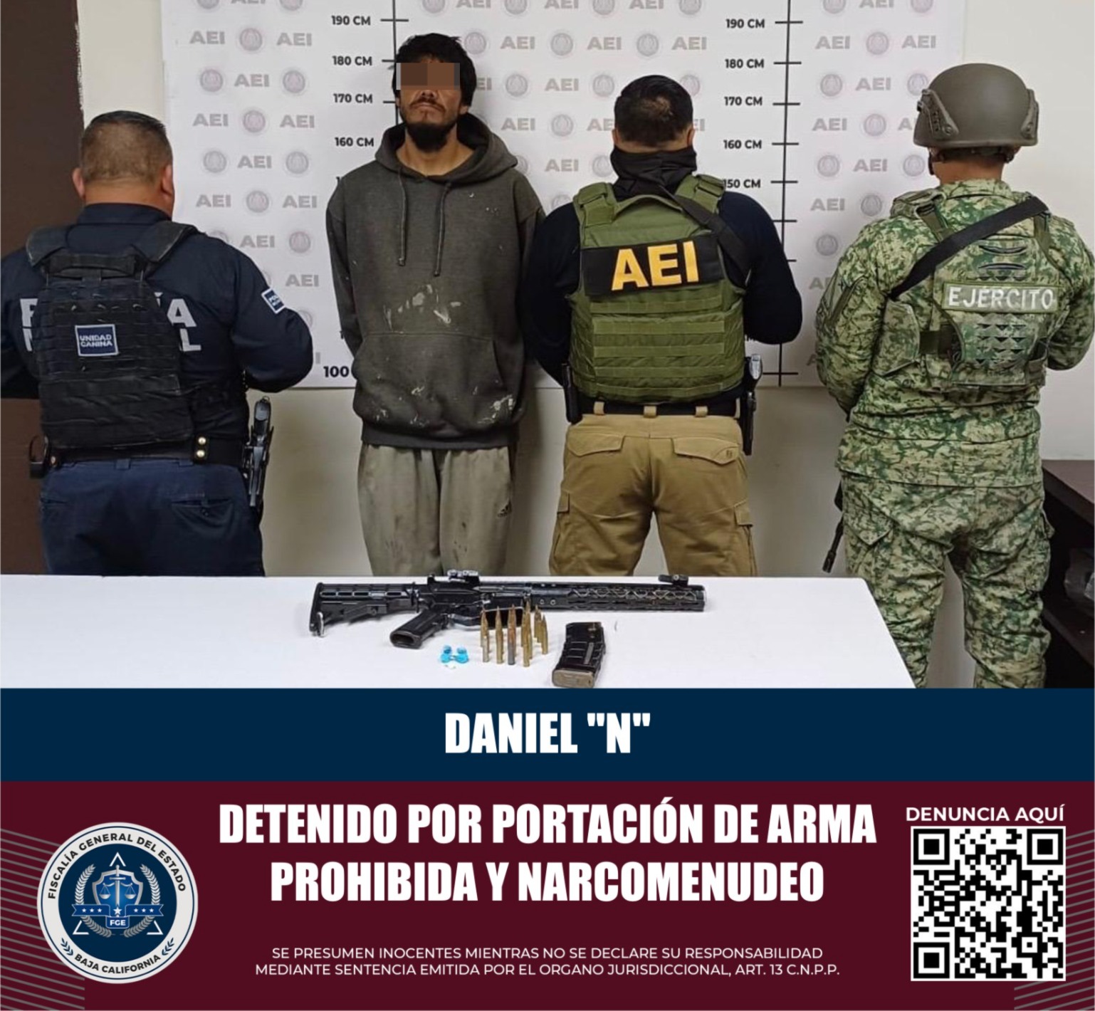 Cómo resultado de estas acciones, se logró el aseguramiento de un individuo de nombre Daniel “N”, por el delito de portación de un arma de fuego y narcomenudeo, ya que se le encontró con un arma larga y cinco envoltorios de plástico con una sustancia granulada al tacto denominada como metanfetamina dando un peso total de 4 gramos aproximadamente.