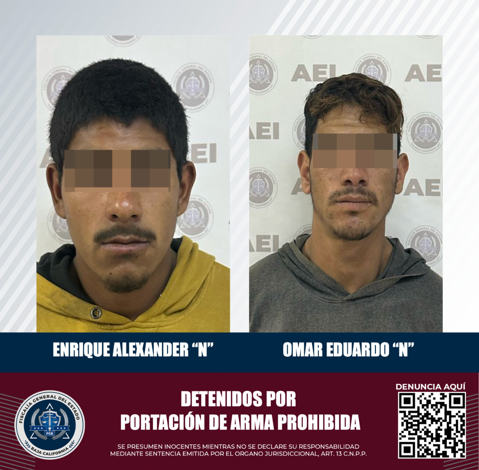 SAN QUINTÍN, BAJA CALIFORNIA. - Agentes de la Fiscalía General del Estado detuvieron a dos individuos por portación de arma prohibida en distintos hechos ocurridos el 20 de marzo de 2025, en la vía pública.