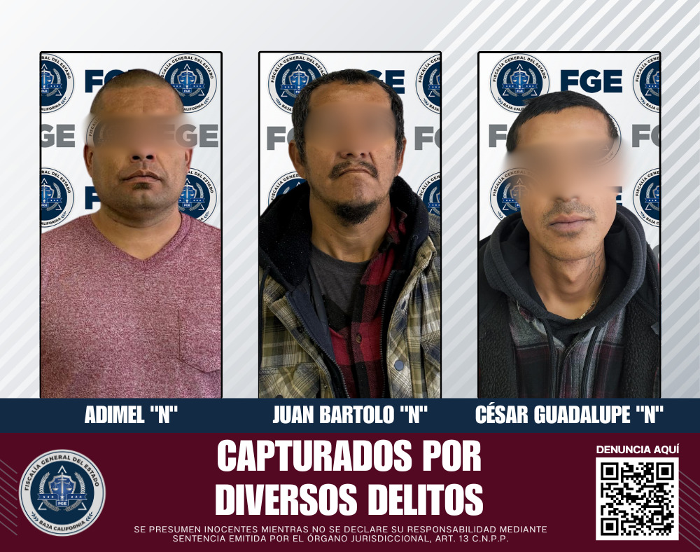 ENSENADA, BAJA CALIFORNIA. - La Fiscalía General del Estado, a través de la Agencia Estatal de Investigación (AEI), cumplimentó tres órdenes de aprehensión en distintos puntos de la ciudad, asegurando a personas relacionadas con delitos de daño en propiedad ajena, robo y narcomenudeo.