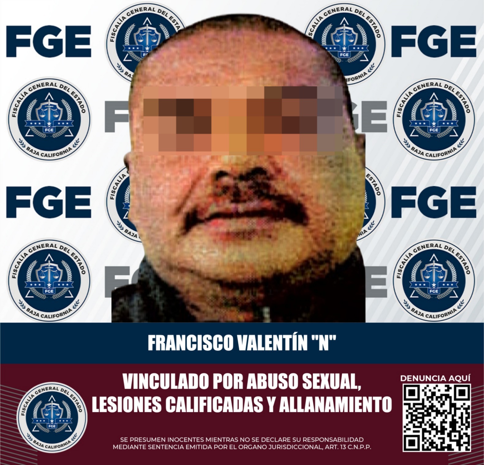 TIJUANA, BAJA CALIFORNIA. - La Fiscalía General del Estado, con la labor de la Fiscalía Especializada en Delitos Contra la Mujer por Razón de Género, informa que se logró obtener la vinculación a proceso de un masculino de nombre Francisco Valentín “N”, a quien se le señala por su presunta responsabilidad en los delitos de abuso sexual, lesiones calificadas y allanamiento de morada.