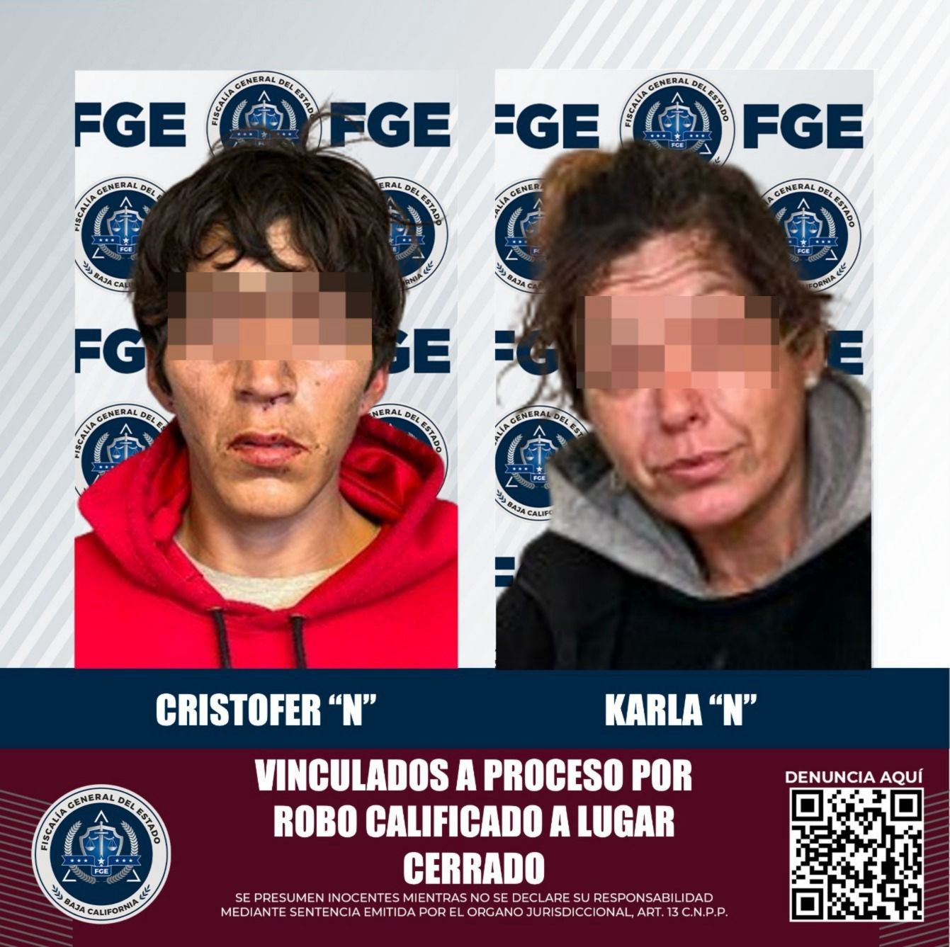 PLAYAS DE ROSARITO, BAJA CALIFORNIA. - -La Fiscalía General del Estado, a través de la Fiscalía Regional de Playas de Rosarito, logró que fueran vinculados a proceso Cristofer "N" y Karla "N" , quienes son acusados del delito de robo calificado a lugar cerrado.