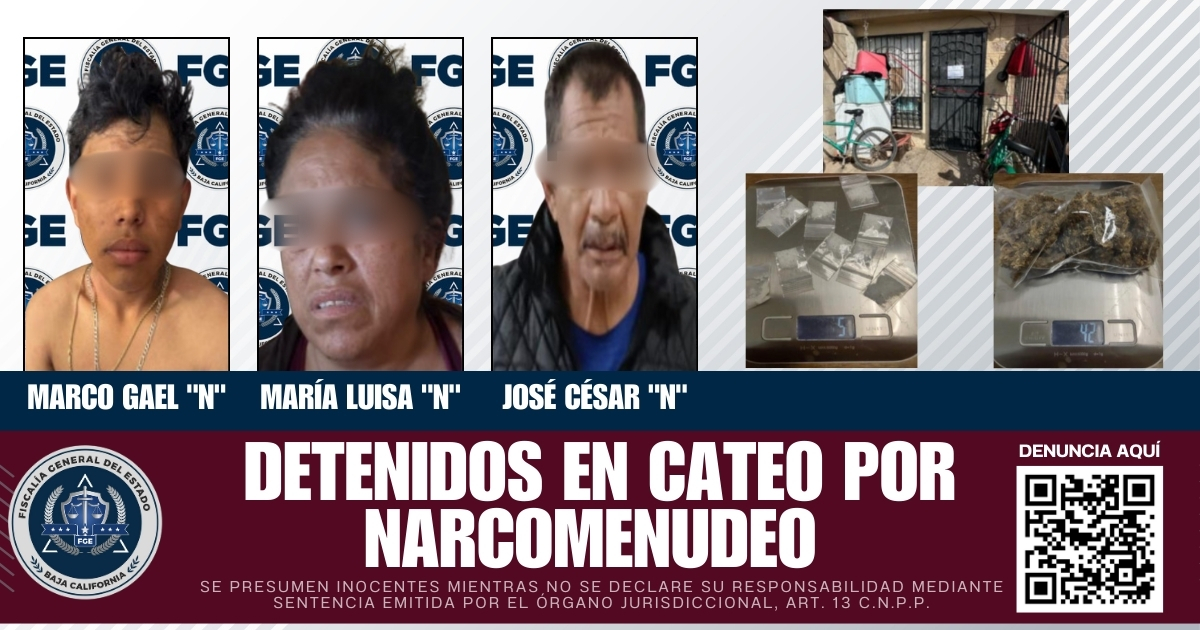 ENSENADA, BAJA CALIFORNIA. - La Fiscalía General del Estado, a través de la Fiscalía Especializada en Narcomenudeo, ejecutó un cateo en un domicilio ubicado en la calle Cangrejo, en la colonia Pórticos del Mar, logrando la detención de tres personas y el aseguramiento de sustancias ilícitas.
