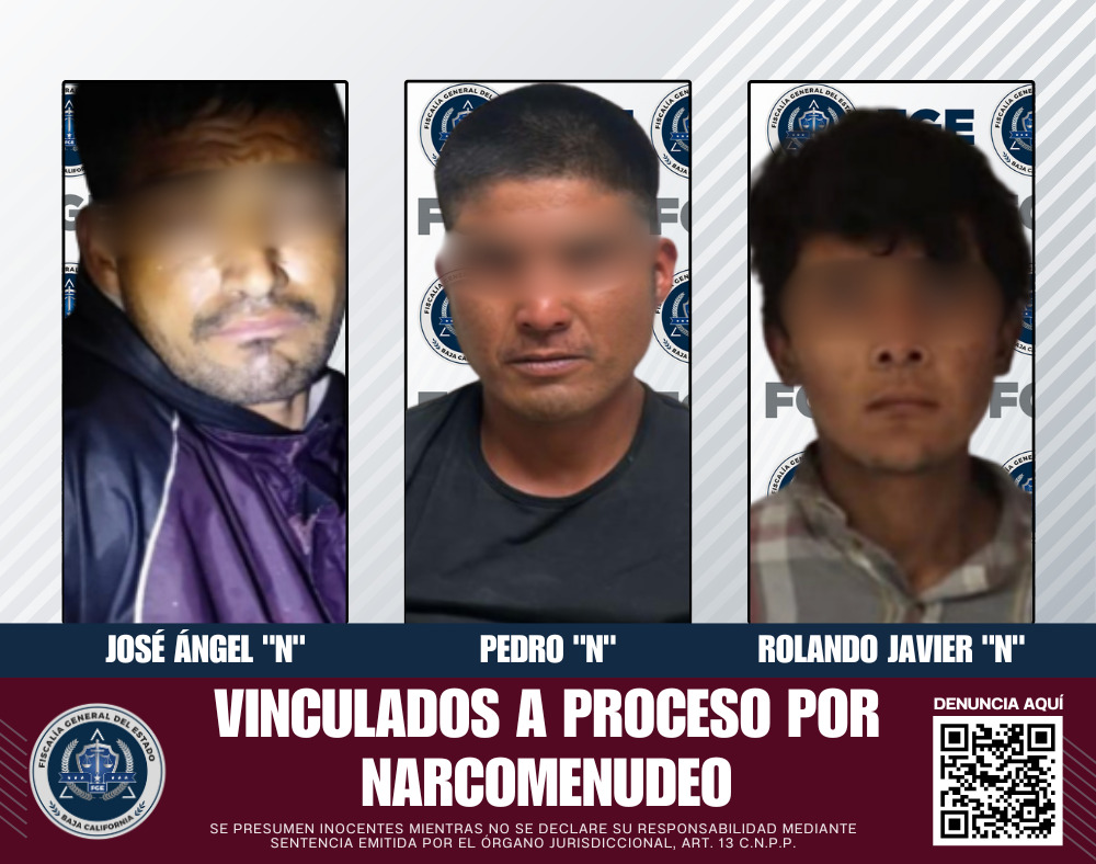 ENSENADA, BAJA CALIFORNIA. - La Fiscalía General del Estado, a través de la Fiscalía Especializada en Narcomenudeo, logró la vinculación a proceso de tres hombres detenidos en distintos operativos, quienes fueron encontrados en posesión de sustancias ilícitas en diversos puntos del municipio de Ensenada.