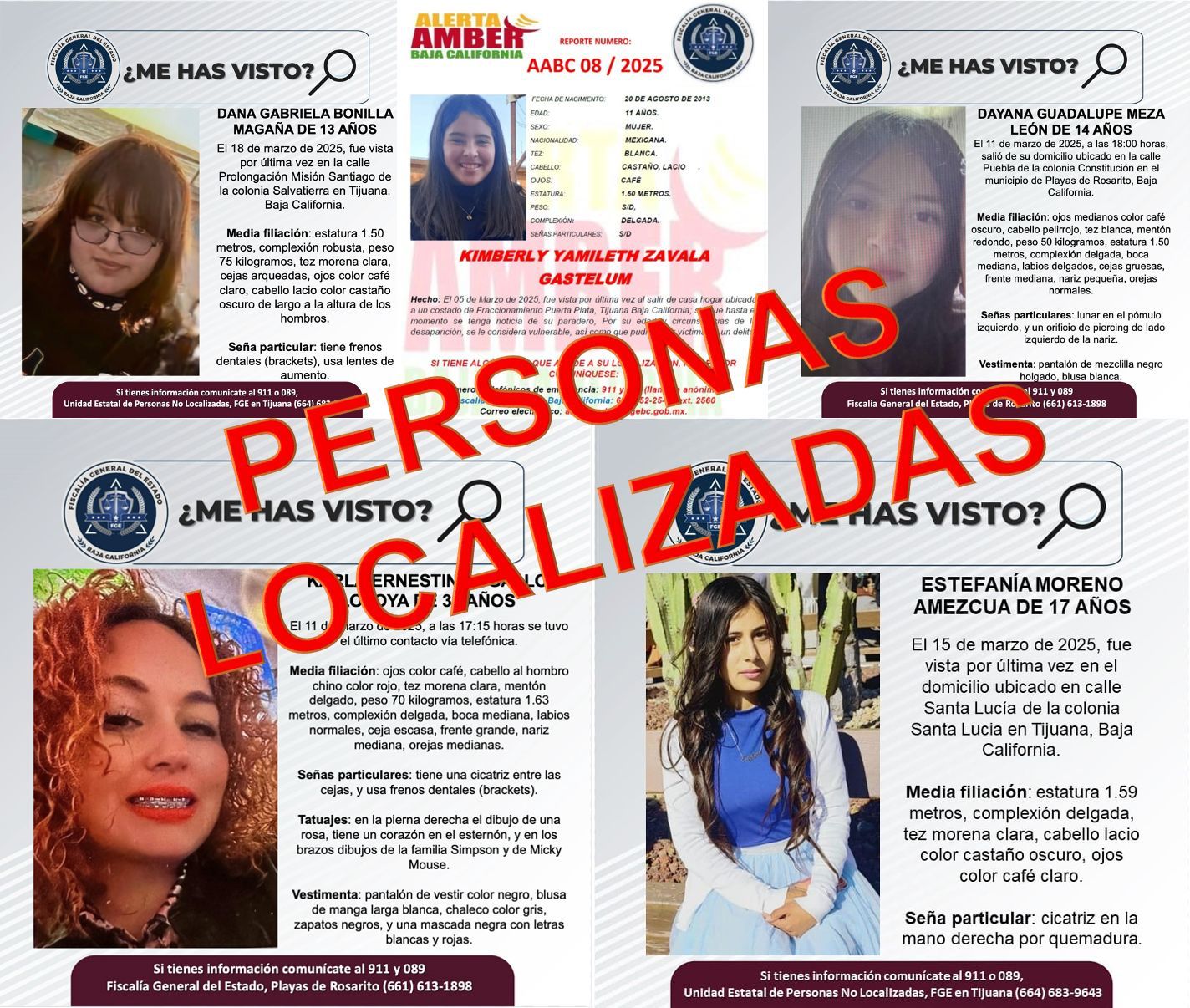 Las personas localizadas son Dana Gabriela Bonilla Magaña de 13 años, Estefanía Moreno Amezcua de 17 años, Karla Ernestina Ugallo Lozoya de 38 años, Kimberly Yamileth Zavala Gastélum de 11 años, y Dayana Guadalupe Meza León de 14 años de edad.