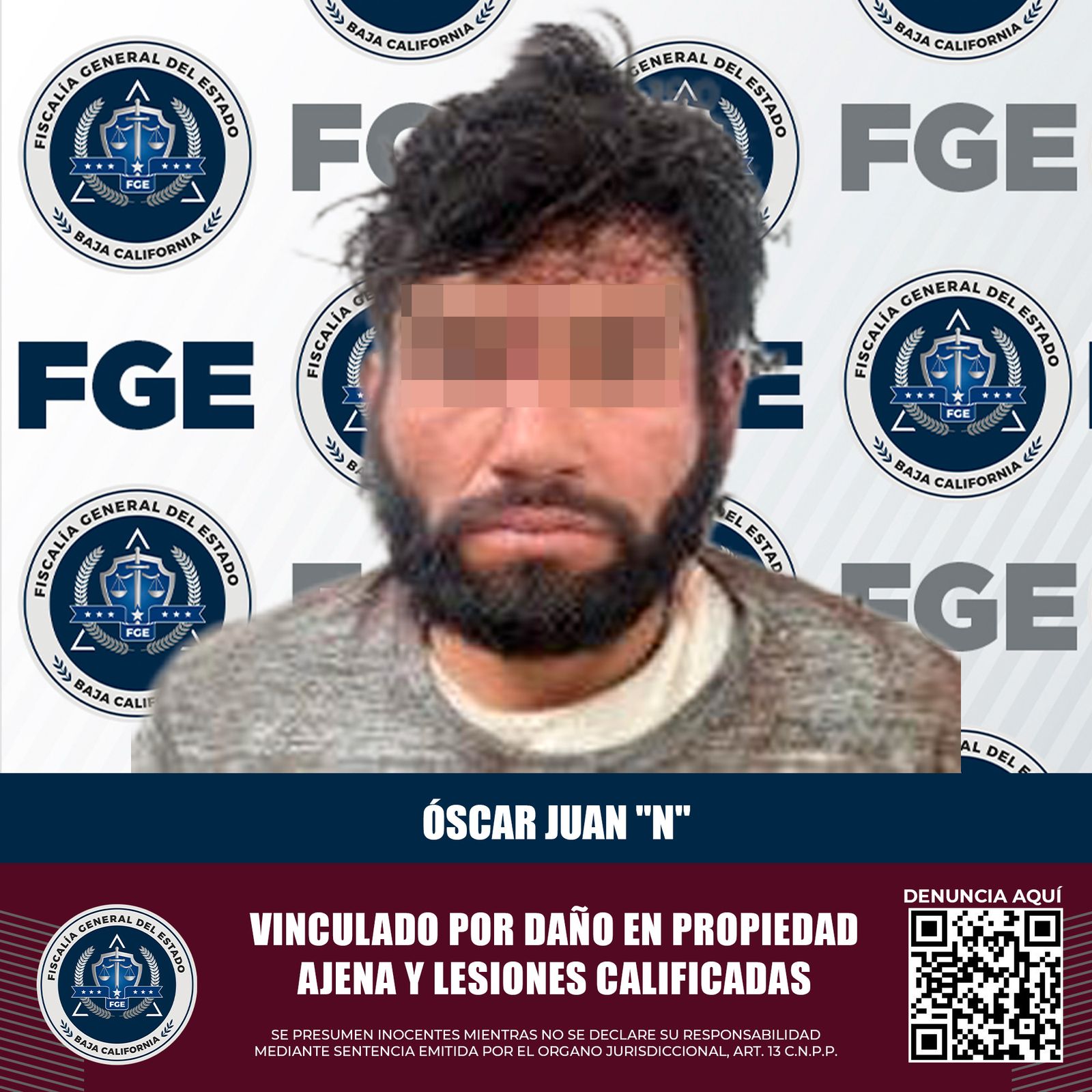 MEXICALI, BAJA CALIFORNIA. - La Fiscalía Regional de Mexicali, a través de la Unidad de Investigación con Detenido Poniente, logró la vinculación a proceso de un hombre, por su presunta responsabilidad en los delitos de daño en propiedad ajena y lesiones calificadas.