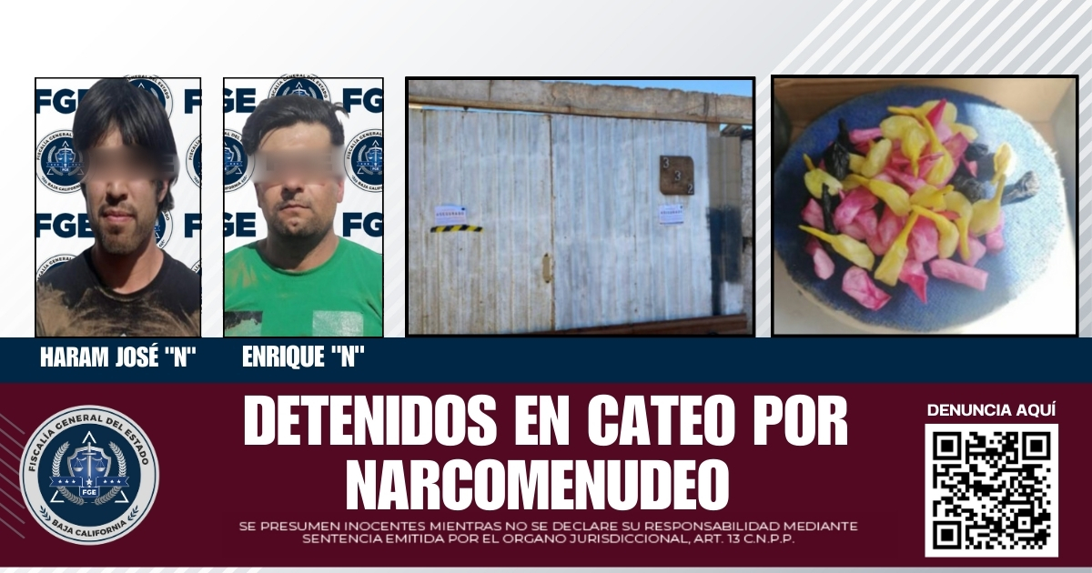 SAN QUINTÍN, BAJA CALIFORNIA. - Como resultado de acciones estratégicas contra el narcomenudeo, la Fiscalía General del Estado cumplimentó una orden de cateo en un domicilio ubicado en San Quintín, donde fueron detenidos dos hombres y se aseguró droga.
