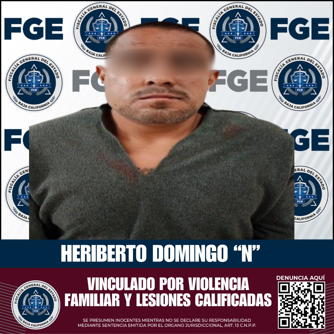 ENSENADA, BAJA CALIFORNIA. - La Fiscalía Regional de Ensenada logró la vinculación a proceso de Heriberto Domingo “N”, señalado como presunto responsable de violencia familiar y lesiones calificadas.