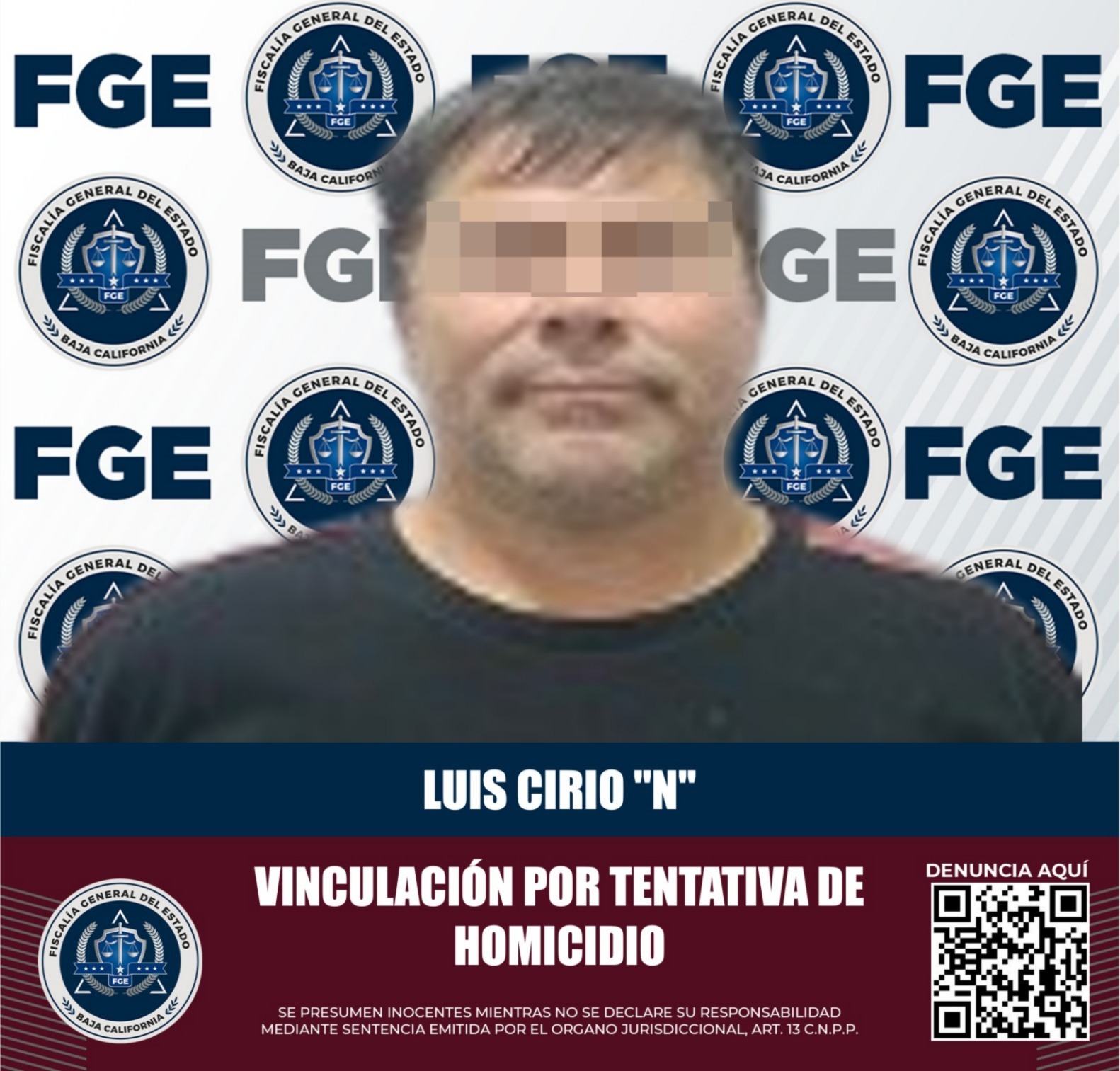 TIJUANA, BAJA CALIFORNIA. - La Fiscalía General del Estado (FGE), a través de la Fiscalía Especializada en Delitos Contra la Vida, informan sobre la vinculación a proceso de Luis Cirio "N", también conocido como "Lucillo", "Luisillo" y "Luis Cirilo", por el delito de homicidio calificado en su grado de ejecución de tentativa.