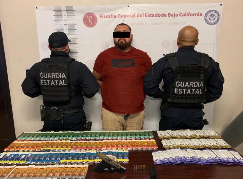 Bello N, de 25 años de edad, originario de Chula Vista. Al realizar una revisión precautoriamente al vehículo se encontró 101 paquetes de Cannabis Oil, y otros 100 con Cannabis Medical.