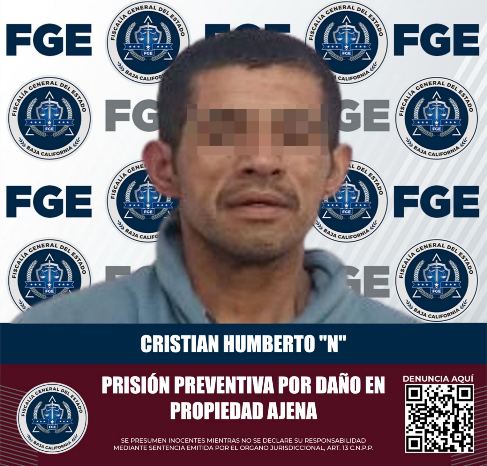 TIJUANA, BAJA CALIFORNIA. - La Fiscalía General del Estado informa que Cristian Humberto “N”, permanecerá en prisión preventiva justificada mientras se determina su presunta participación en el delito de daño en propiedad ajena agravado por incendio.