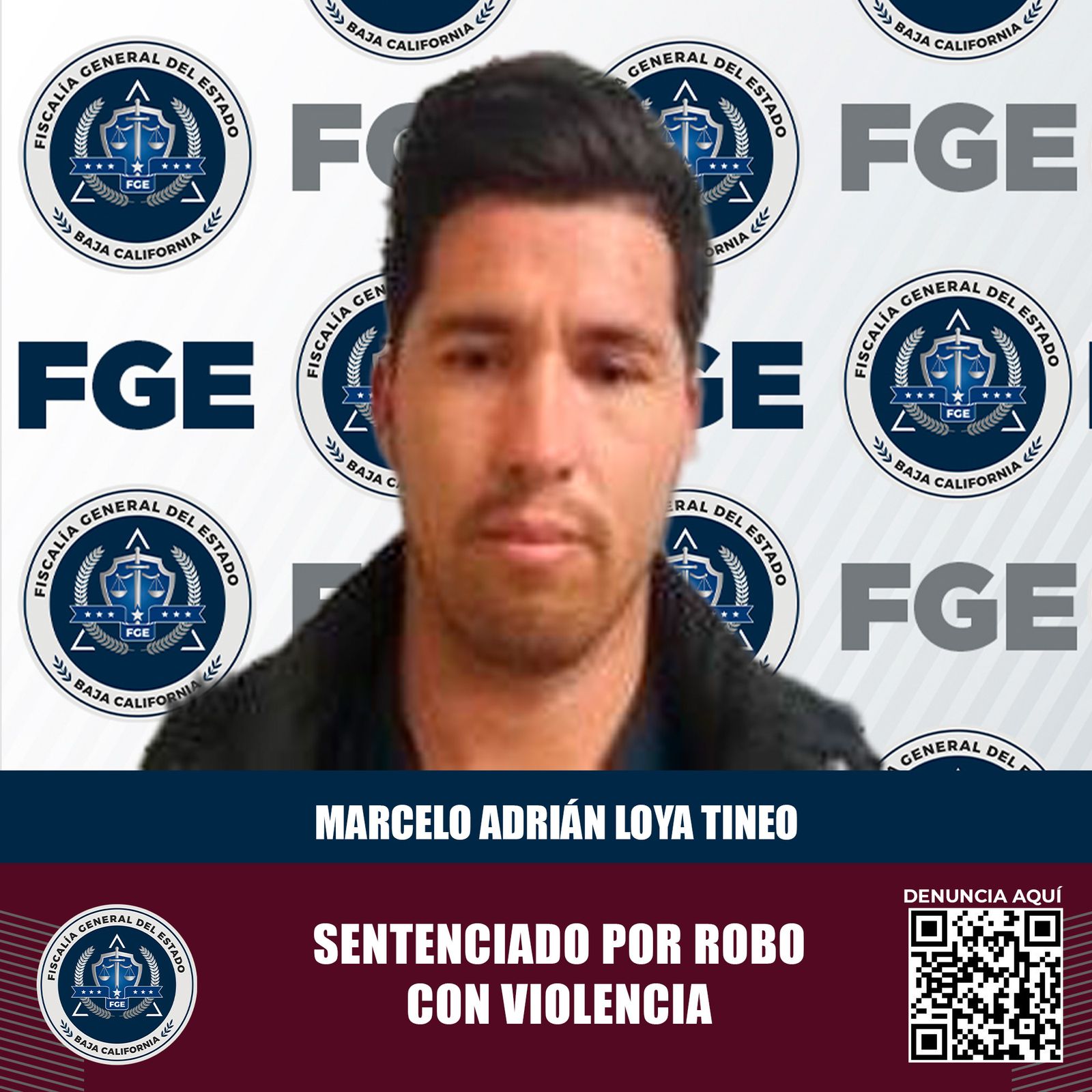 MEXICALI, BAJA CALIFORNIA. - La Fiscalía Regional de Mexicali, obtuvo sentencia de cuatro años de prisión contra Marcelo Adrián Loya Tineo, acusado de delito de robo calificado cometido en establecimiento comercial abierto al público con violencia.
