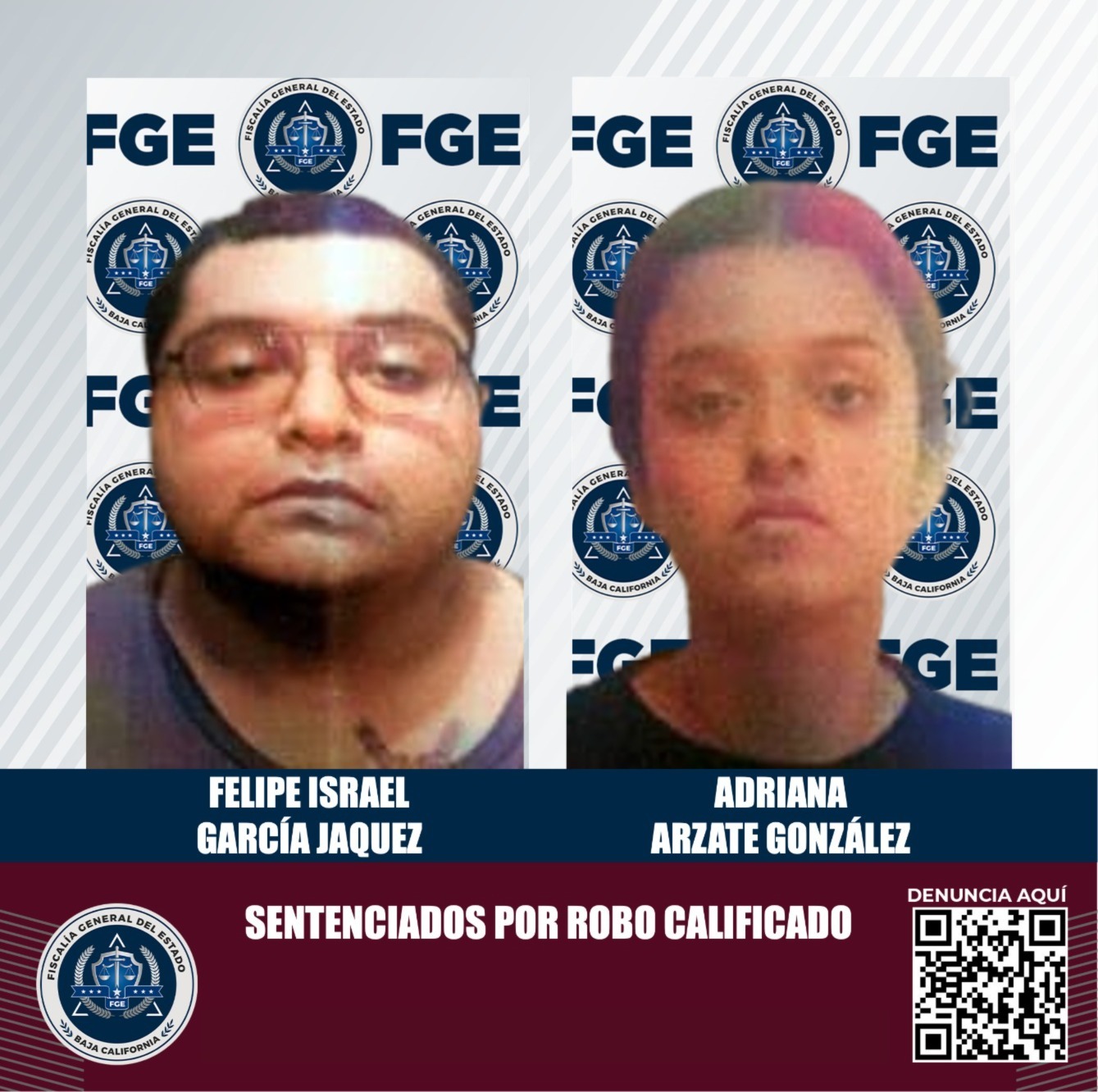 TIJUANA, BAJA CALIFORNIA. - La Fiscalía Regional de Tijuana, a través de la Unidad de Investigación de Robos La Mesa, obtuvo la sentencia condenatoria en contra de Felipe Israel García Jaquez y Adriana Arzate González por su responsabilidad en el delito de Robo Calificado a Comercio Abierto al Público Ejecutado con Violencia.