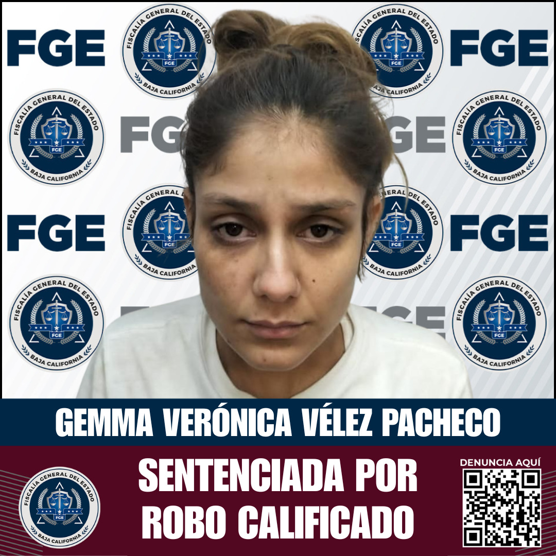 ENSENADA, BAJA CALIFORNIA. - La Fiscalía Regional de Ensenada, a través de la Unidad de Investigación de Robos, obtuvo una sentencia condenatoria de 5 años y 4 meses de prisión en contra de Gemma Verónica Vélez Pacheco, por el delito de robo calificado cometido en establecimiento comercial abierto al público.