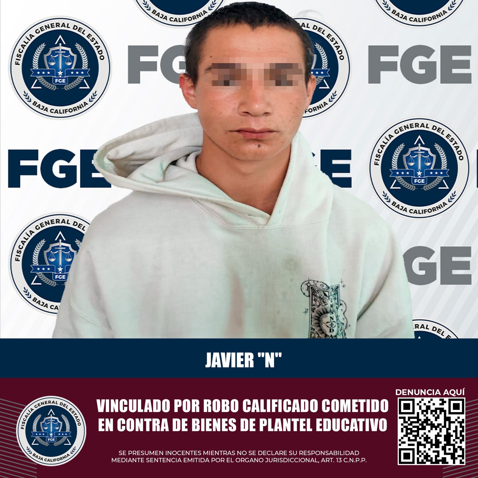 MEXICALI, BAJA CALIFORNIA. - La Fiscalía Regional de Mexicali, a través de la Unidad de Investigación de Robos Oriente, logró vincular a proceso a Javier “N” por el delito de robo calificado cometido en contra de bienes de un plantel educativo.