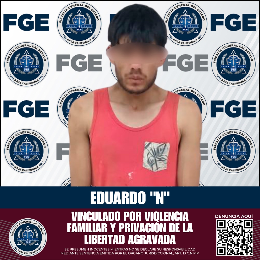 SAN QUINTÍN, BAJA CALIFORNIA - 3 DE ABRIL DE 2025.- La Fiscalía General del Estado (FGE) ha obtenido la vinculación a proceso y la imposición de prisión preventiva justificada, en atención al riesgo que representa para la víctima, contra el imputado Eduardo “N” por los delitos de violencia familiar y privación ilegal de la libertad.
