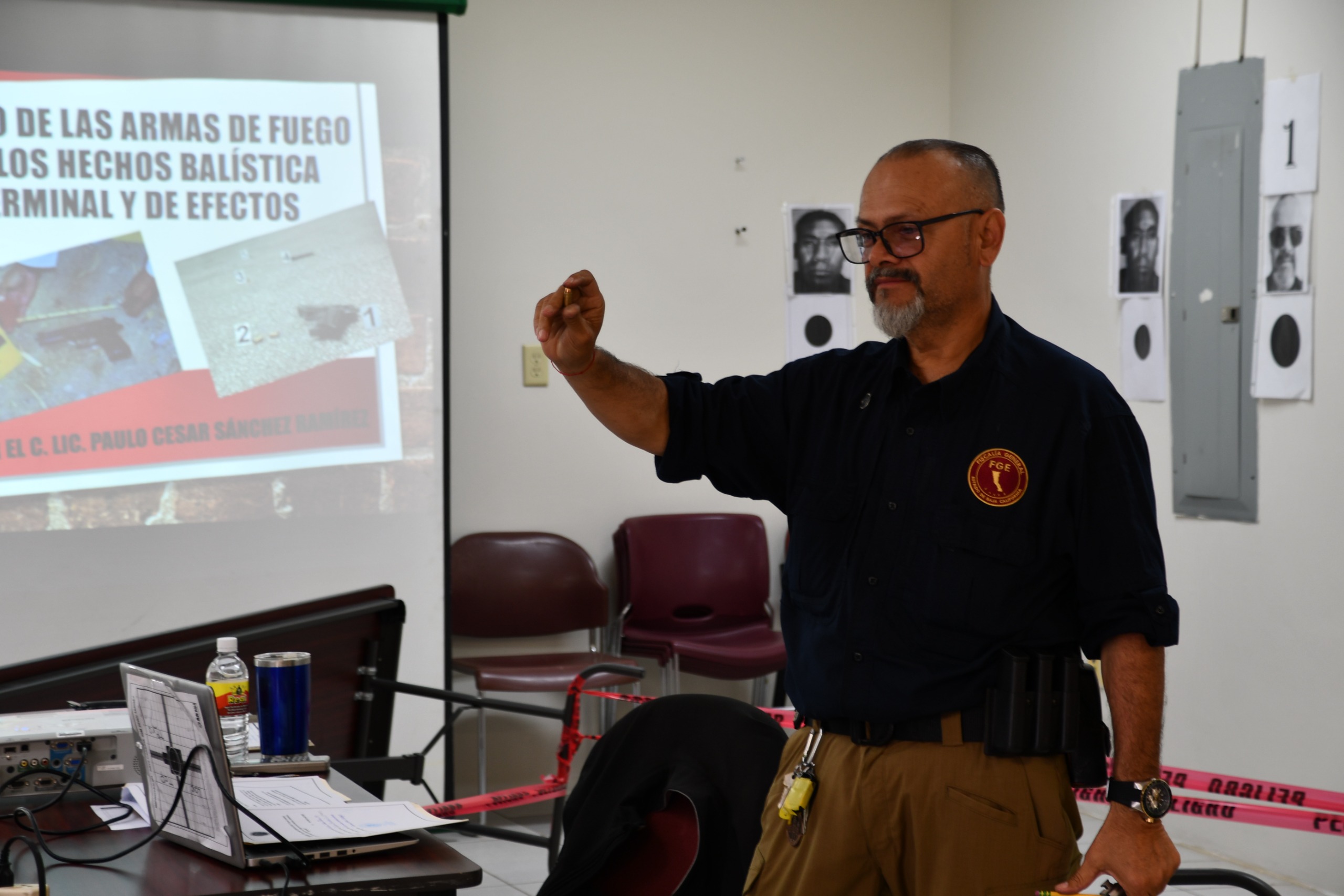 Alumnos del quinto semestre de dicha institución acudieron a las instalaciones del Instituto Estatal de Investigación y Formación Interdisciplinaria de la Fiscalía en Ensenada, donde participaron en el curso “Manejo Seguro de Armas de Fuego en el Lugar de Intervención: Balística Elemental”, impartido por el Agente de Investigación, Lic. Paulo César Sánchez Ramírez.