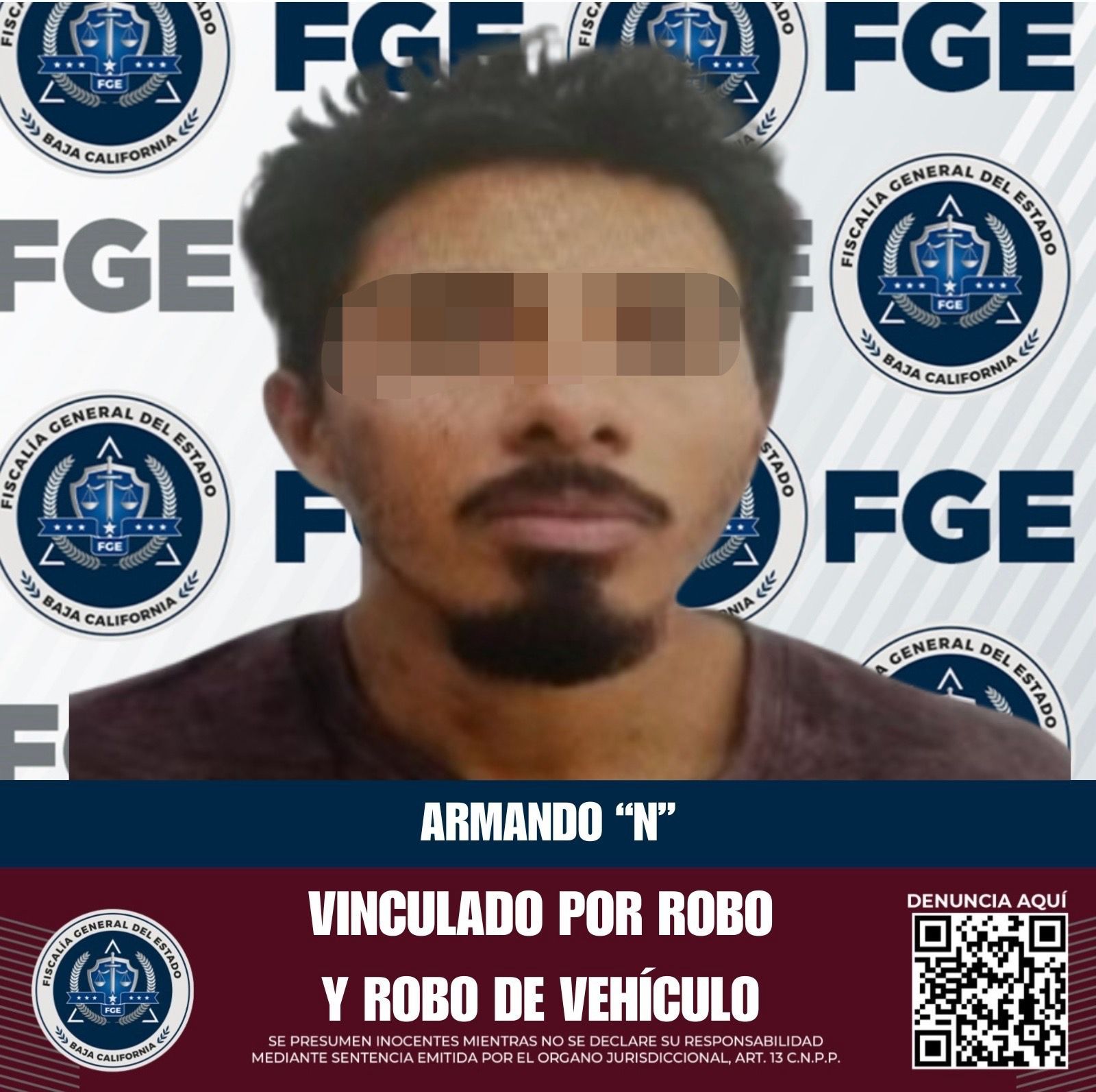 TECATE, BAJA CALIFORNIA. - La Fiscalía Regional de Tecate, informó que luego de presentar contundentes datos de prueba por parte de la Unidad de Investigación Contra Robos se logró vincular a proceso al masculino Armando “N”, por los delitos de robo y robo de vehículo.