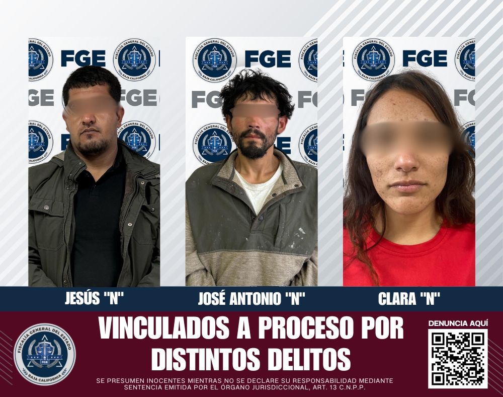 ENSENADA, BAJA CALIFORNIA. - La Fiscalía Regional de Ensenada, con base en los datos de prueba recabados por el agente del Ministerio Público, logró la vinculación a proceso de tres personas detenidas por su presunta implicación en distintos delitos.