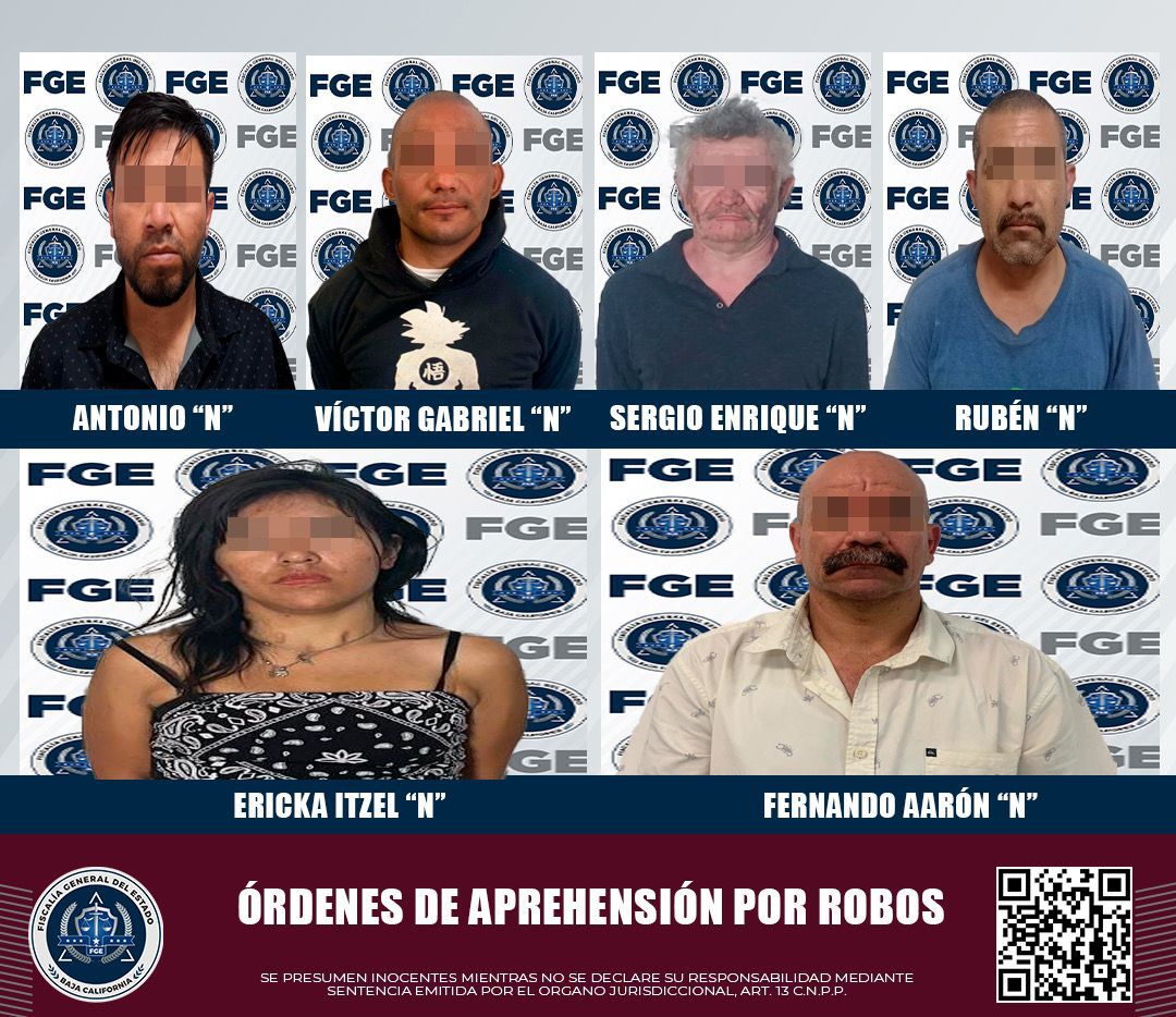 MEXICALI, BAJA CALIFORNIA. - Elementos de la Agencia Estatal de Investigación (AEI), adscritos a los grupos de Robo de Vehículo, Robos Poniente, Oriente y Aprehensiones, llevaron a cabo diversas acciones que resultaron en la captura de seis personas que contaban con órdenes de aprehensión relacionadas con delitos de robo en sus distintas modalidades.