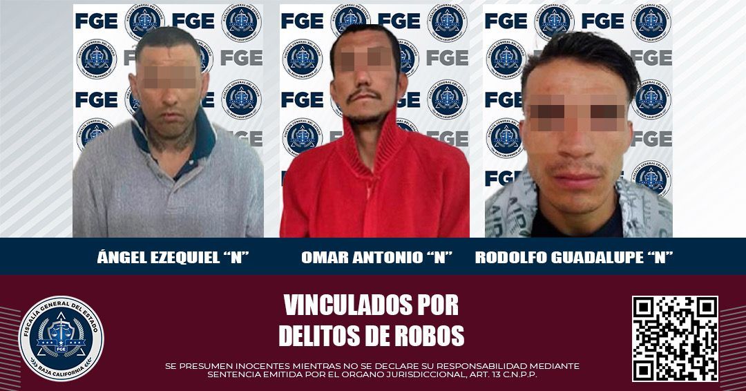 MEXICALI, BAJA CALIFORNIA. - La Fiscalía Regional de Mexicali, a través de la Unidad de Investigación de Robos Oriente y Detenidos Oriente, logró con base en los elementos de prueba y argumentos presentados, la vinculación a proceso de tres hombres relacionados en los delitos de robo con violencia.