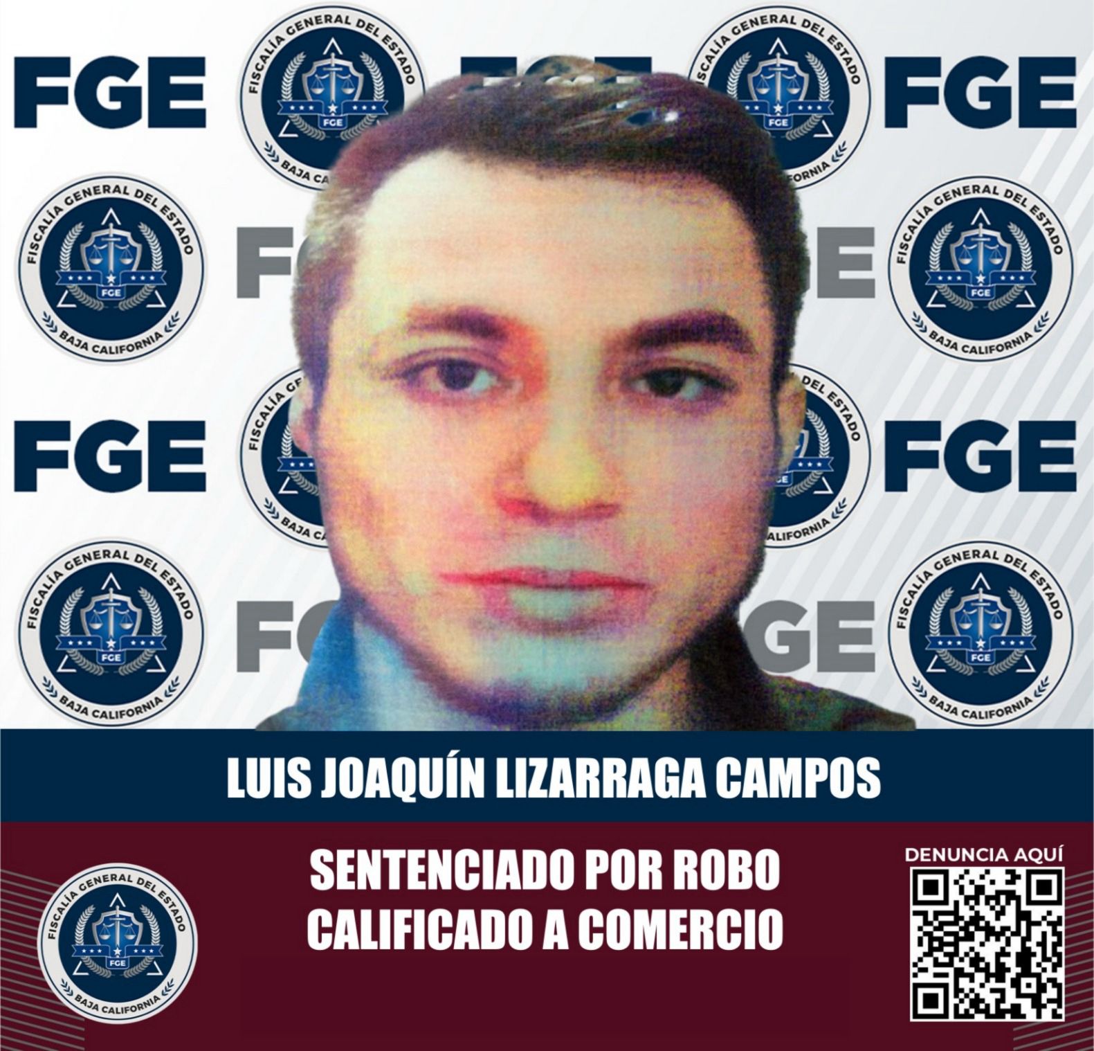 TIJUANA, BAJA CALIFORNIA. - Gracias a las investigaciones en gabinete y campo de la Unidad de investigación de Robos Zona Centro, adscrita a la Fiscalía Regional de Tijuana, se logró obtener una sentencia condenatoria en contra de Luis Joaquín Lizarraga Campos, alias Joaquín Meza Torres, al comprobar su responsabilidad en el delito de robo calificado a comercio abierto al público, ejecutado con violencia.