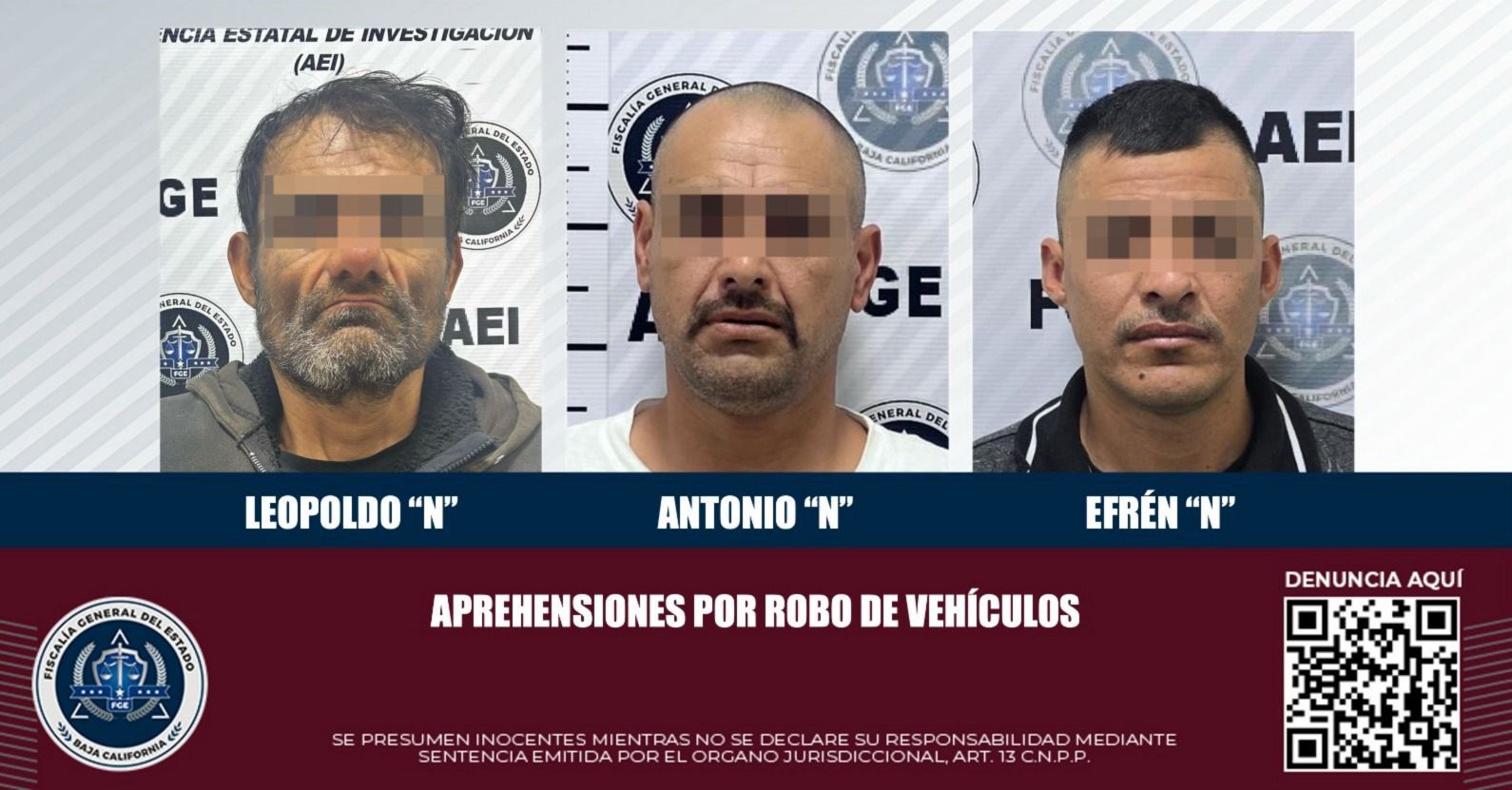 TIJUANA, BAJA CALIFORNIA. - La Fiscalía General del Estado, a través de la Agencia Estatal de Investigación (AEI) en la Zona Tijuana, informa sobre la captura de tres individuos que contaban con órdenes de aprehensión vigentes por delitos relacionados con el robo de vehículos.