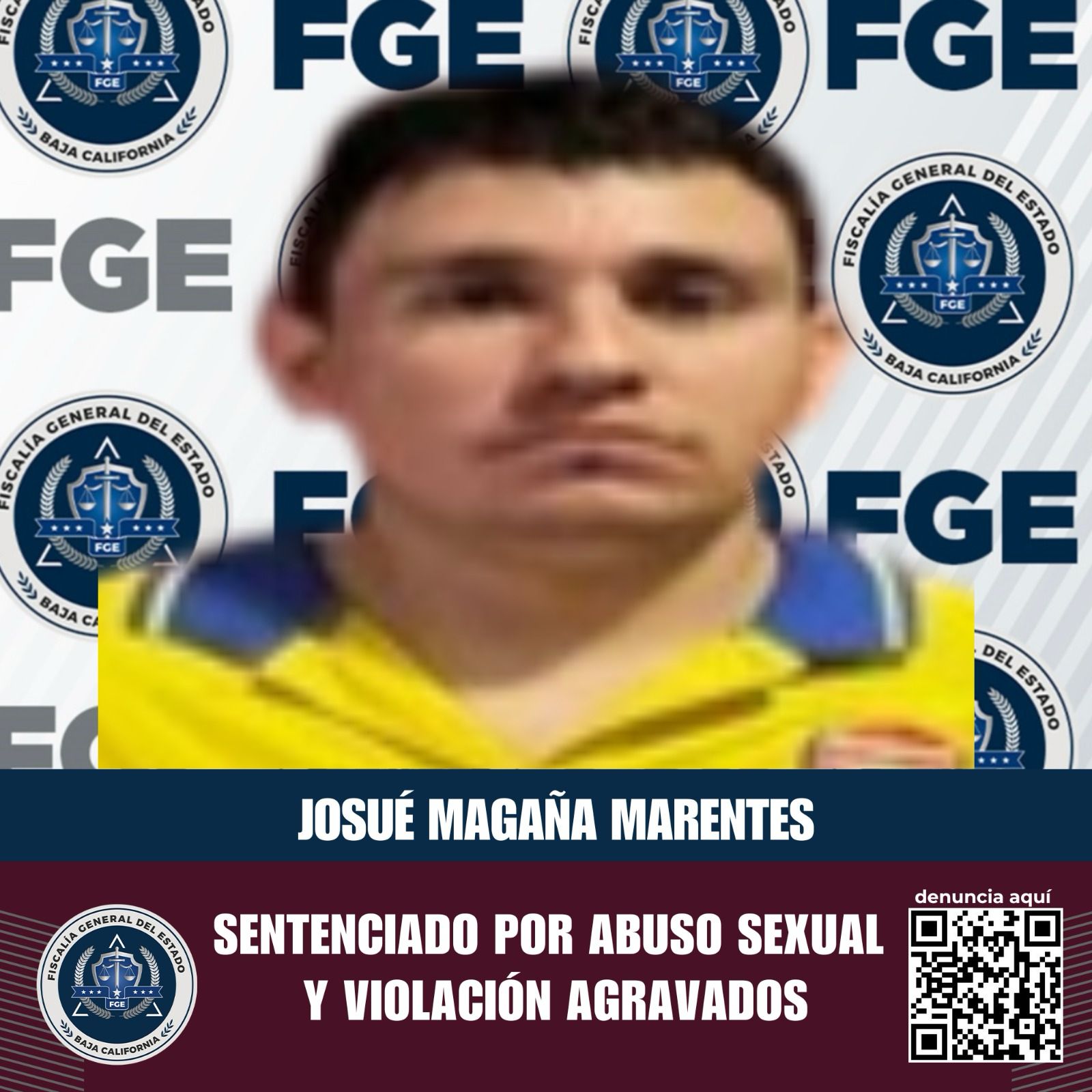 TIJUANA, BAJA CALIFORNIA. - La Fiscalía General del Estado informa que, como resultado del trabajo firme y coordinado de la Unidad de Investigación Especializada en Delitos Sexuales, adscrita a la Fiscalía Especializada en Delitos contra Mujeres por Razón de Género, se obtuvo una sentencia condenatoria de 16 años de prisión en contra de Josué Magaña Marentes, por su responsabilidad penal en la comisión de los delitos de abuso sexual y violación agravados.
