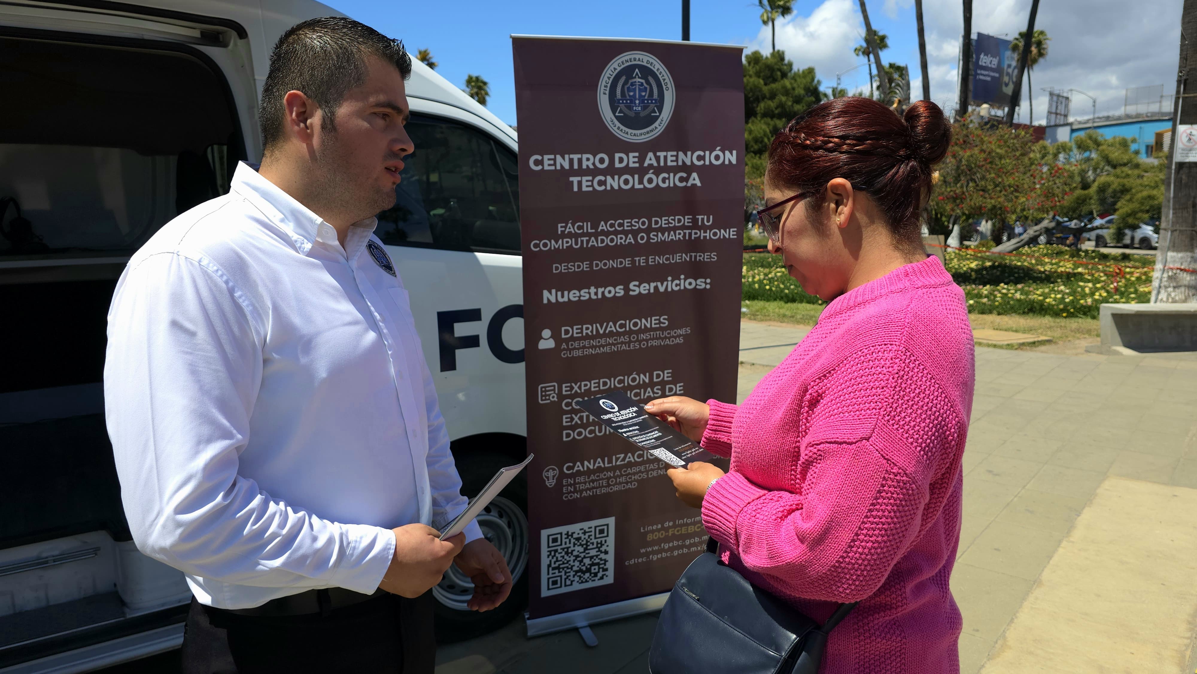 ENSENADA , BAJA CALIFORNIA. - La Fiscalía de Baja California, encabezada por la Fiscal General, Dra. Ma. Elena Andrade Ramírez, participa en las actividades de Semana Santa en Ensenada, acercando sus servicios a la población a través del Centro de Atención Tecnológica (CAT), instalado en la Explanada Cívica de la Patria.