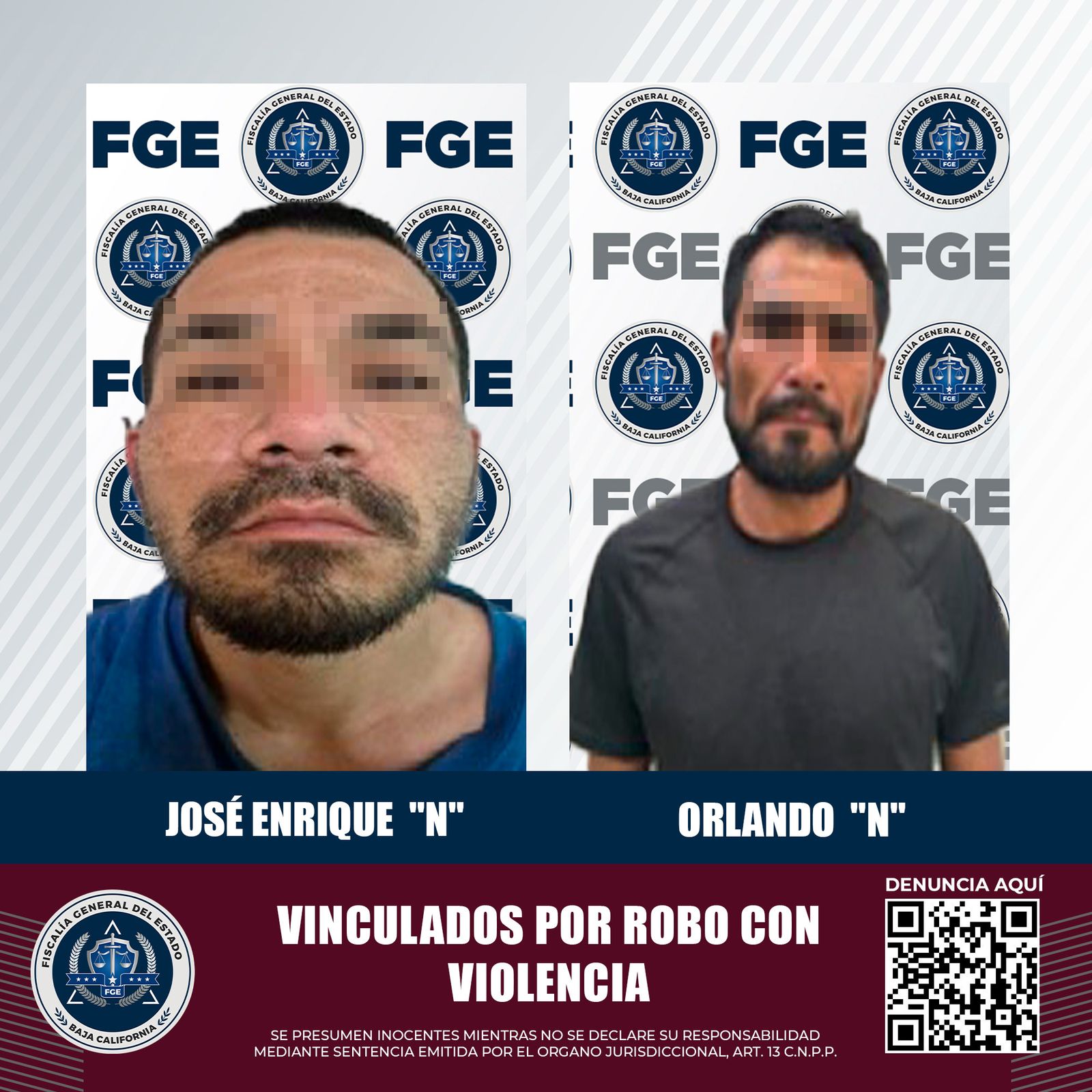 MEXICALI, BAJA CALIFORNIA. - La Fiscalía Regional de Mexicali, a través del trabajo realizado por las Unidades de Investigación de Detenidos Oriente y con Detenidos Poniente, logró la vinculación a proceso de dos hombres relacionados con robos violentos.