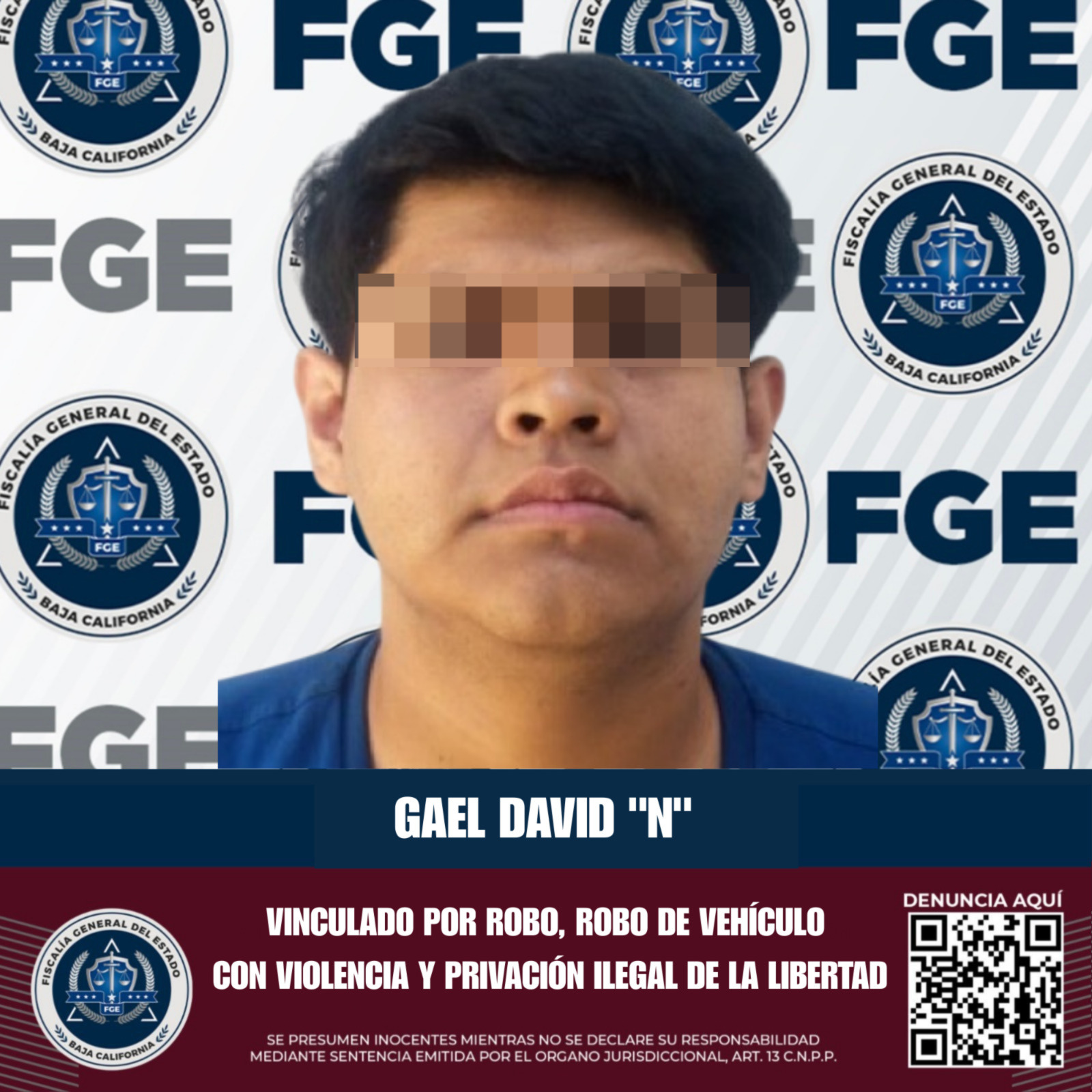 TIJUANA, BAJA CALIFORNIA. - La Fiscalía Regional de Tijuana, a través de la Unidad de Investigación de Robo de Vehículos, derivado de labores de inteligencia en gabinete y campo, logró acreditar ante el Juez de Control datos de prueba suficientes para obtener auto de vinculación a proceso en contra de Gael David “N”, por su probable responsabilidad en la comisión de los delitos de robo, robo de vehículo con violencia y privación ilegal de la libertad.