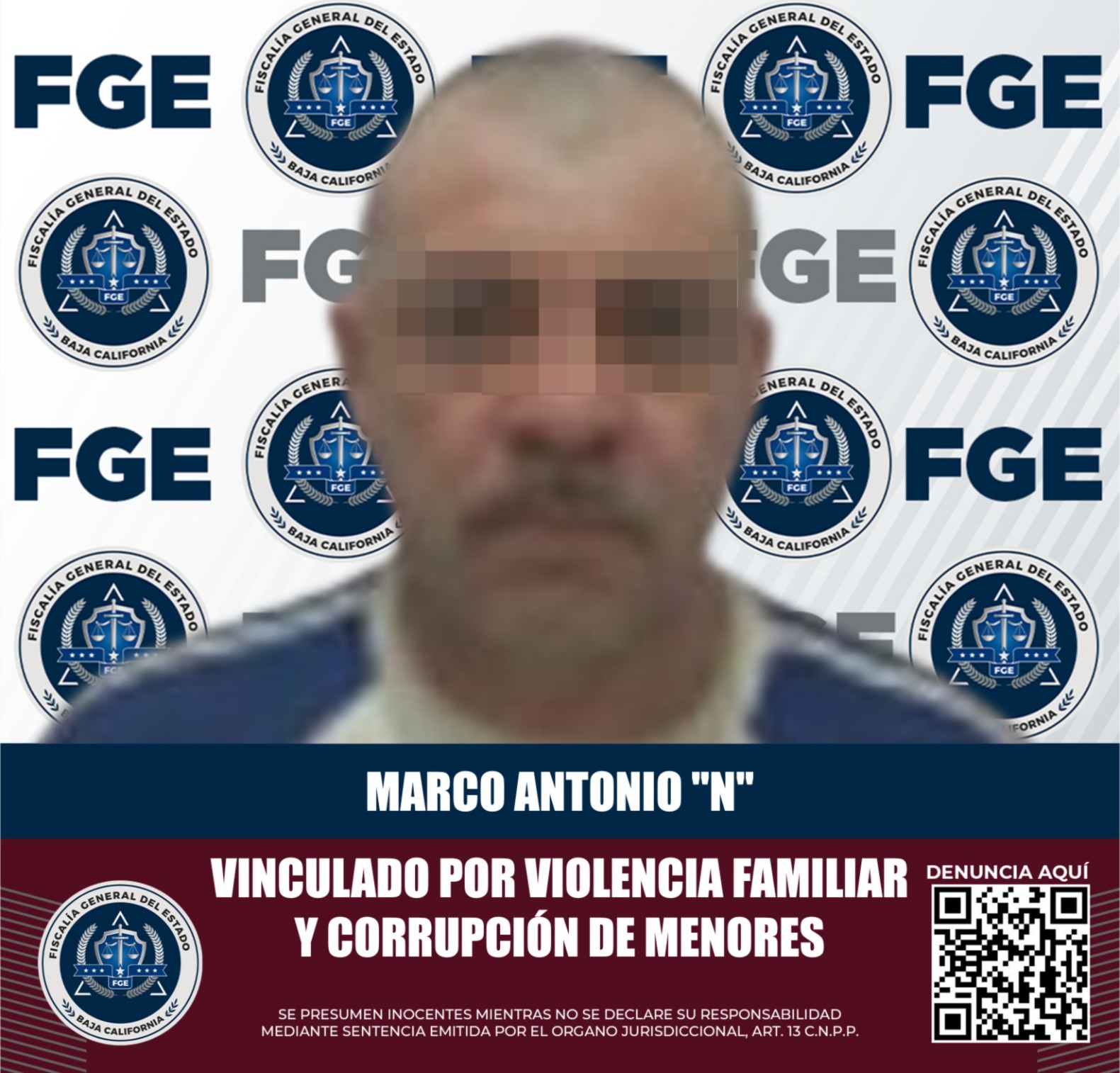 MEXICALI, BAJA CALIFORNIA. - La Fiscalía Regional de Mexicali, a través de la Unidad de Investigación con Detenidos Poniente, logró la vinculación a proceso de Marco Antonio “N” por su probable responsabilidad en los delitos de violencia familiar y corrupción de menores, luego de que se presentaran pruebas sólidas durante la audiencia inicial.