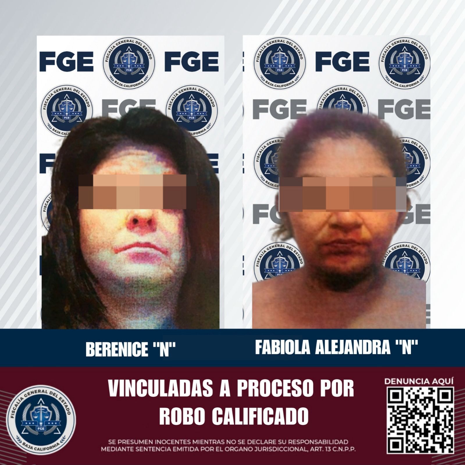 TIJUANA, BAJA CALIFORNIA. - Gracias a la presentación de datos de prueba contundentes, de la Unidad de Investigación Especializada en Robos, Zona Centro, adscrita a la Fiscalía Regional de Tijuana, se logró que se impusiera la medida cautelar de prisión preventiva justificada a dos mujeres, señaladas por su presunta responsabilidad en el delito de robo calificado cuando se cometa en establecimiento comercial abierto al público, en hechos distintos.