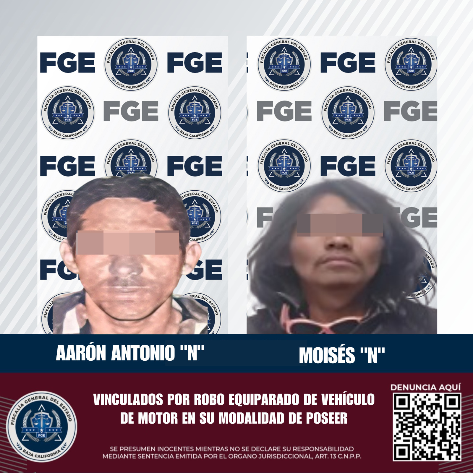 TIJUANA, BAJA CALIFORNIA. - La Fiscalía General del Estado (FGE) a través de la Fiscalía Regional de Tijuana y la Unidad de Investigación con Detenido, informa sobre la vinculación a proceso de dos personas del sexo masculino, por su presunta responsabilidad en el delito de robo equiparado de vehículo de motor en su modalidad de poseer, en distintos hechos registrados en esta ciudad.