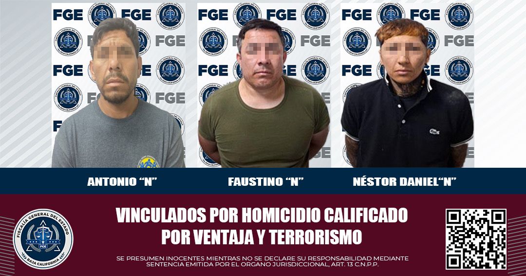 MEXICALI, BAJA CALIFORNIA. - La Fiscalía General del Estado logró la vinculación a proceso de tres integrantes de un grupo delictivo, considerados como objetivos prioritarios, por los delitos de homicidio calificado con ventaja y terrorismo.