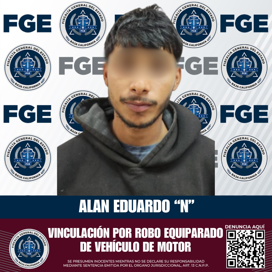 SAN QUINTÍN, BAJA CALIFORNIA. - La Fiscalía Regional de San Quintín logró la vinculación a proceso de Alan Eduardo “N”, por el delito de robo equiparado de vehículo de motor.