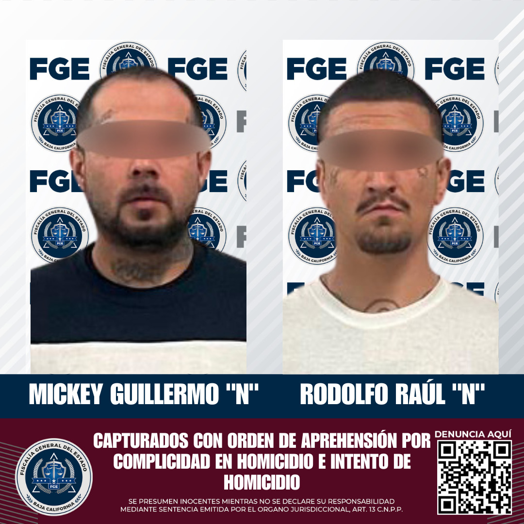 ENSENADA, BAJA CALIFORNIA. - Como parte de las acciones de coordinación interinstitucional impulsadas por la Fiscal General del Estado, Dra. Ma. Elena Andrade Ramírez, agentes de la Fiscalía General del Estado (FGE), en colaboración con la Fuerza Estatal de Seguridad Ciudadana, cumplimentaron órdenes de aprehensión en contra de dos personas de nacionalidad estadounidense con cargos pendientes en su país por delitos graves.