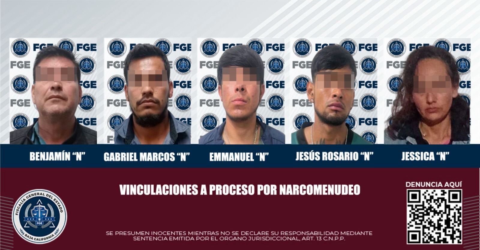 TIJUANA, BAJA CALIFORNIA. - La Fiscalía General del Estado informa que cinco imputados por delitos contra la salud en la modalidad de narcomenudeo fueron vinculados a proceso penal, luego de que el Ministerio Público presentara los elementos de prueba suficientes para que los jueces de control determinaran iniciar los procedimientos correspondientes.