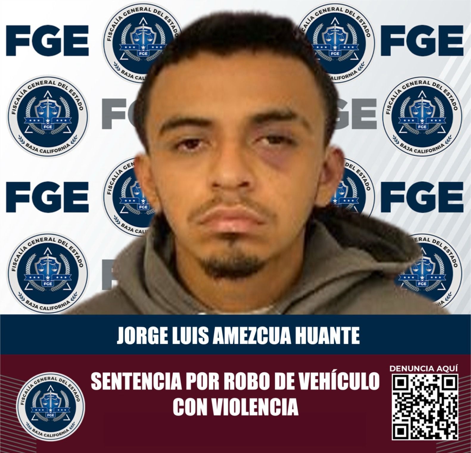 TIJUANA, BAJA CALIFORNIA. - La Fiscalía General del Estado obtuvo una sentencia de cinco años y cuatro meses de prisión en contra de Jorge Luis Amezcua Huante, luego de que se demostrara su responsabilidad en el delito de robo de vehículo con violencia.
